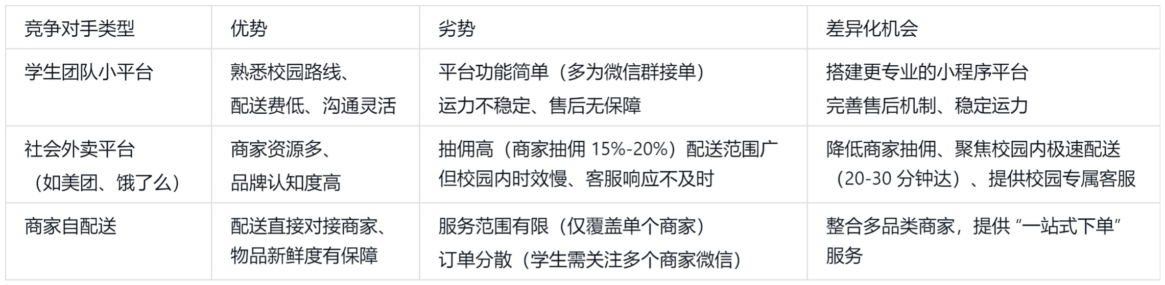 调研校园内已有的跑腿服务(如其他学生团队搭建的小平台、社会外卖平台驻校服务、商家自配送),分析其优势与劣势,找到自己的差异化机会: