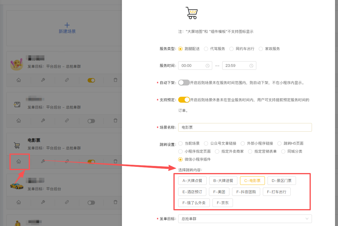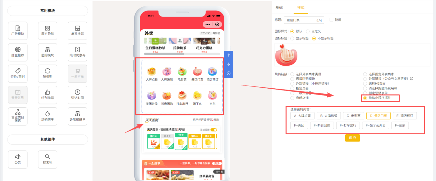 操作步骤:在外卖模块的魔方导航跑腿场景配置跳转的设置页面,选择“微信小程序插件”,选择需要跳转的内容,保存即可!